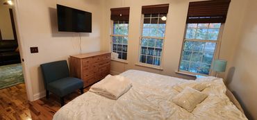 Enjoy a river view from your King-size bed. Bedroom includes all bedding, a large closet, dresser, chair, end tables with lamps, and a 43" smart TV.